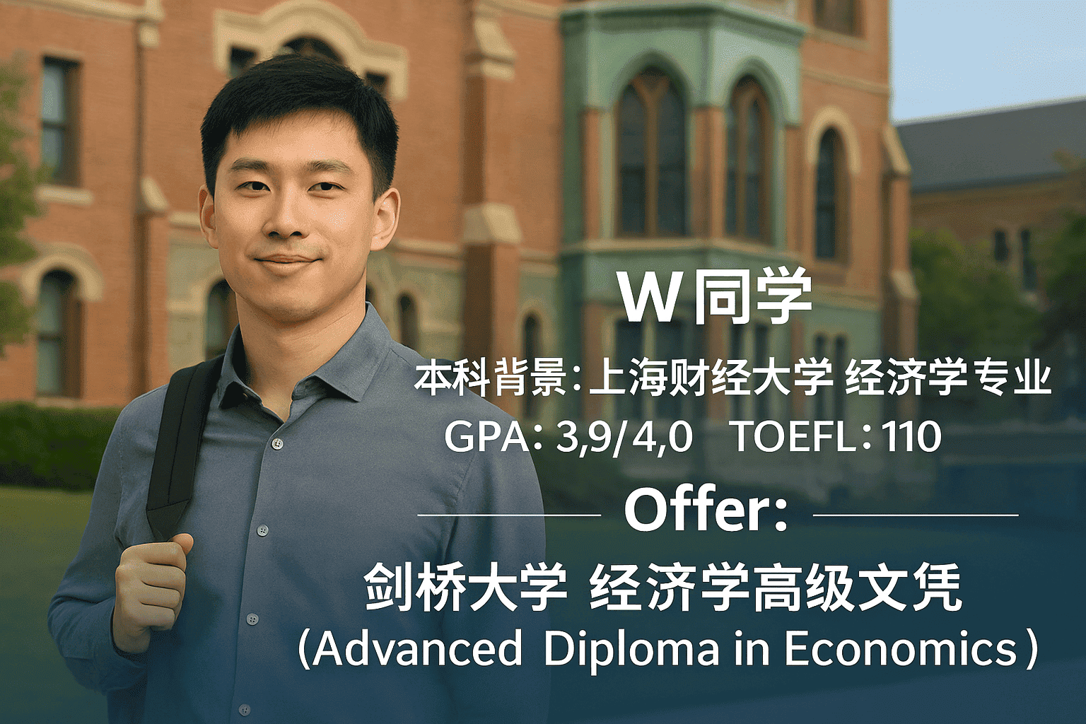 W同学 本科背景: 上海财经大学 经济学专业GPA: 3.9/4.0 TOEFL: 110 Offer:剑桥大学 经济学高级文凭(Ad
